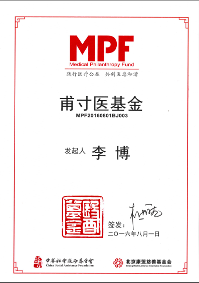 为了传递医患正能量、传递健康理念、传承医学知识技能,李博大夫联合中华社会救助基金会医基金发起了“甫寸医基金公益项目”,旨在为中国基层医生(仅限于省会以下社区、乡村医务室等医生)提供参加一线城市(包括不仅限于北京、上海、深圳、广州等地区)学术交流、医学培训、跟诊学习所需经费,为我国的基层医疗卫生人员提供参与学习机会,提升基层医疗卫生人员的诊疗水平,促进我国医疗卫生事业的发展。